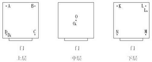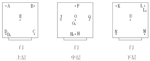 測量點(diǎn)O、Oh位于工作空間的幾何中心,其他各測量點(diǎn)與試驗(yàn)設(shè)備內(nèi)壁的距離為各自邊長的1/10,但不小于50mm。 工作室容積大于2m3時(shí),溫度測量點(diǎn)為15個(gè),相對(duì)濕度測量點(diǎn)為4個(gè),位置如圖2。 測量點(diǎn)E、O、Oh、U位于上、中、下層的幾何中心,其他各測量點(diǎn)與試驗(yàn)設(shè)備內(nèi)壁的距離為各自邊長的1/10,但不小于50mm。 若測出的工作空間的基本參數(shù)不符合GB/T 2423.3、 GB/T 2423.4、 GB 2423.9 、GB 2423.16的要求且與測量點(diǎn)的位置有關(guān)時(shí),可適當(dāng)放寬6.3和6.4規(guī)定的1/10的距離,但應(yīng)在檢定報(bào)告中予以記載。 當(dāng)恒溫恒濕試驗(yàn)箱工作室容積大于50m3時(shí),溫度測量點(diǎn)和相對(duì)濕度測量的數(shù)量可適當(dāng)增加。 |